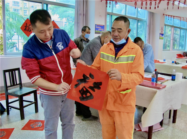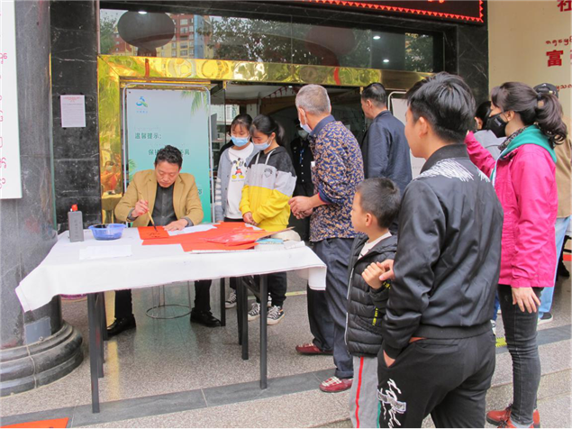 活动当天,州图书馆挂起了大红灯笼,暖意融融,特别邀请外来务工就地过年人员分别来自湖南的肖清华和河南的王德生2位书法爱好者和州书法家协会6名会员一起挥毫泼墨,现场书写福字和春联,赠给留在西双版纳过年的外来务工人员和广大群众。(文图:西双版纳州图书馆 张春华)