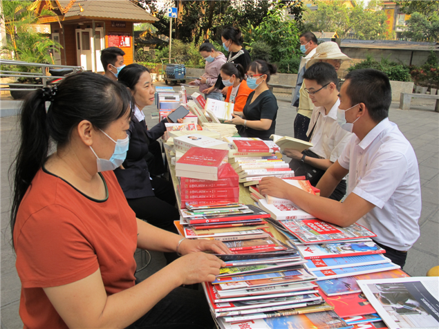 活动当天,州图书馆在大楼前与新知图书景洪分公司联合开展建党100周年主题书展学党史阅读推广活动,集中展示中国共产党党史、新中国史等习近平新时代中国特色社会主义思想读物等重点图书,让广大市民对党史知识有进一步的了解,感悟民族精神。