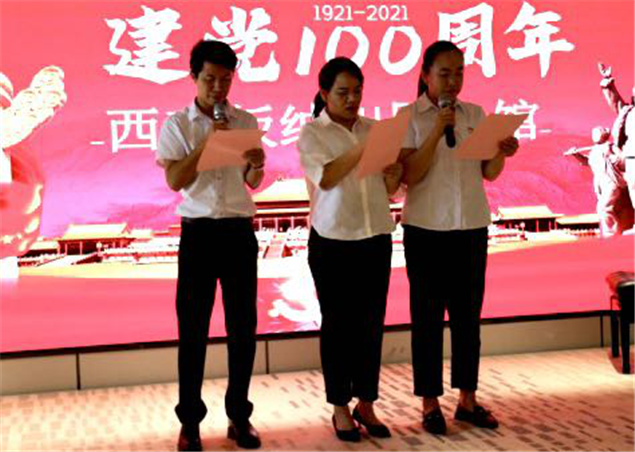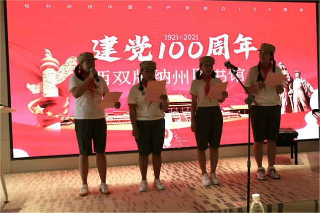 活动一开始,州图书馆党支部书记负责人向干部职工们上“学党史、感党恩、听党话、跟党走”党史教育课,集中学习《中国共产党简史》;用讲故事的形式生动的讲述了西双版纳勐罕镇傣族村寨曼累讷村曼团村民小组,71年前西双版纳解放史“渡江战役”,让大家了解这段红色历史。会上大家还围绕庆祝中国共产党成立100周年主题,唱响红歌《唱支山歌给党听》《没有共产党就没有新中国》《团结就是力量》《学习雷锋好榜样》;诗歌朗诵《七律· 长征》《七律·答友人》《美丽的中国梦》赞美中国共产党领导的中国人民和军队自强不息、艰苦奋斗的优良作风和革命乐观主义精神,讴歌中国共产党带领全国各族人民实现伟大复兴的峥嵘岁月和丰功伟绩。活动展现了广大党员和干部职工爱党、爱国、爱家乡、爱生活,多姿多彩积极向上的精神风貌。(文图:西双版纳州图书馆 张春华)
