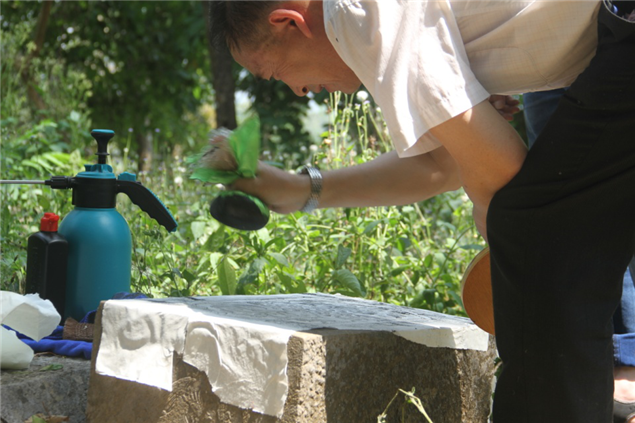 26日下午,调研组一行前往倚邦村曼桂山,对“清乾隆二年敕封德郎、安人碑”及四周散落石碑进行拓印。经过清洁灰尘、上纸、敲打、上墨色、晾干取下等步骤,以较高的识别度成功拓印石碑内容。