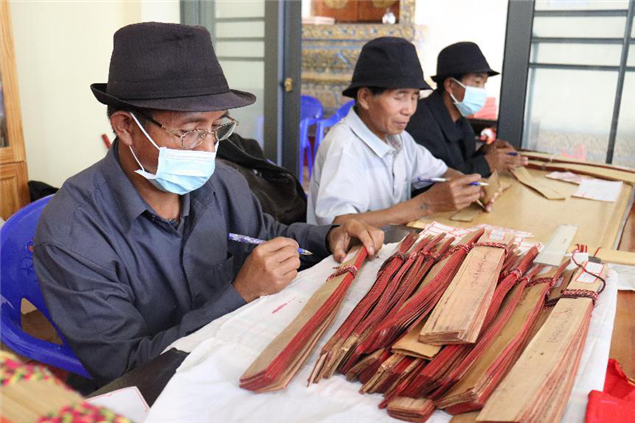 勐海县西定乡章朗村佛寺历史悠久,保存着一批贝叶文化文献资料,为抢救西双版纳贝叶文化古籍,加快全州古籍普查任务,州图书馆组织省外及州内7名古籍文化志愿者,用一个月的时间对这批文献进行了分类编目、查阅、鉴别,现已初步整理出文献资料5634册,16余叶,其中棉纸文献资料3323册,贝叶文献资料1548册。成立章朗村佛寺分中心,对今后章朗村佛寺古籍文献的抢救保护,对传承传统优秀民族文化具有重要的意义。(文图: 西双版纳州图书馆 张春华)