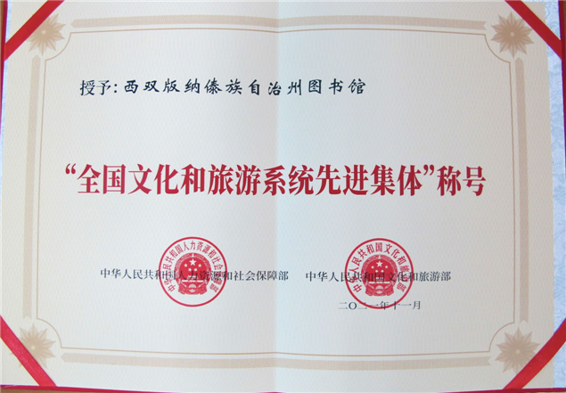 2022年10月,西双版纳州图书馆获国家人力资源社会保障部、文化和旅游部正式授予的2021年“全国文化和旅游系统先进集体”牌匾、证书和光荣册。