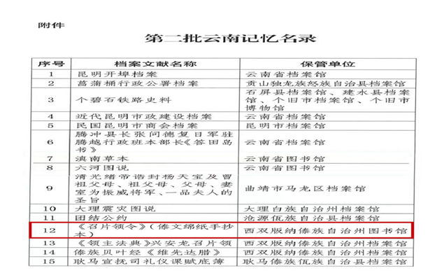 近日,云南省档案局公布了第二批云南记忆名录。西双版纳州图书馆古籍《召片领令》(傣文绵纸手抄本)入选名列其中 。