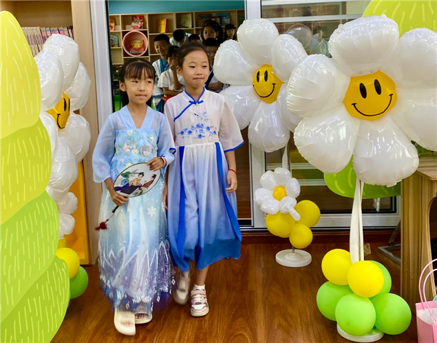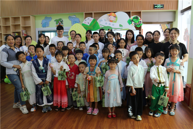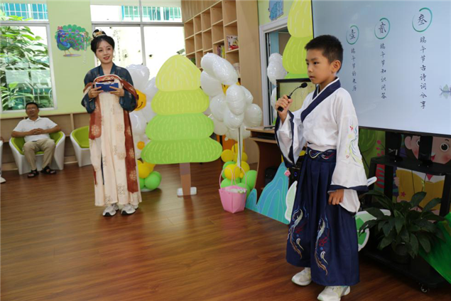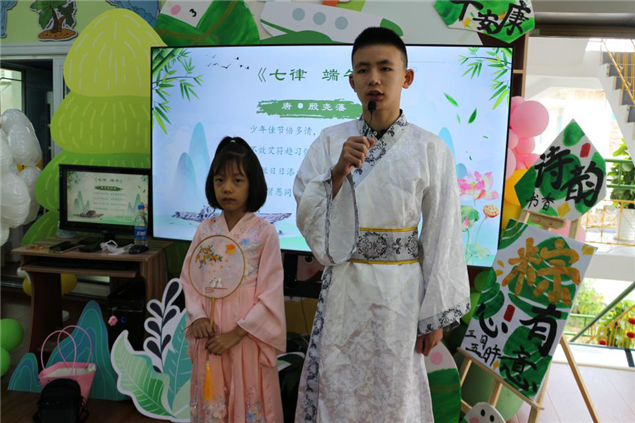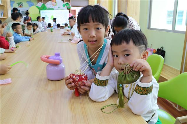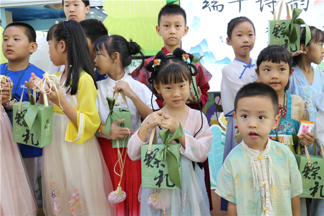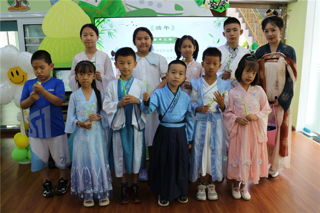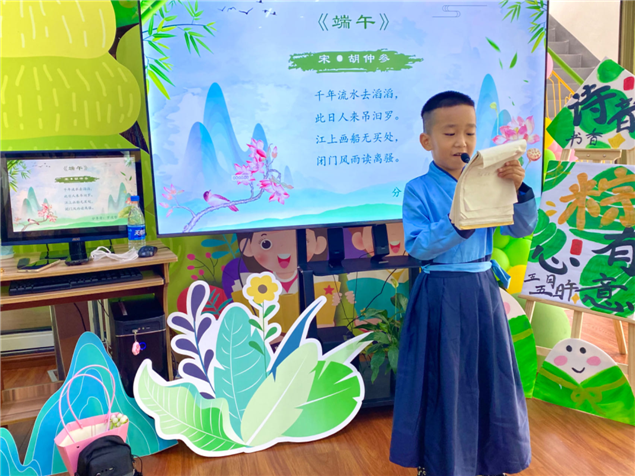 在少儿馆里,州图书馆工作人员向孩子们普及端午节民俗、端午节知识,制作端午香囊、系五彩绳等。活动现场,小朋友们身穿精心准备的汉服,迈着自信的步伐展示传统服饰汉服之美。他们用清脆稚嫩的嗓音,朗诵着一首首经典的《浣溪沙?端午》宋?苏轼、《乙卯重五诗》宋?陆游、《端午》唐?文秀等端午节古诗词。从“彩线轻缠红玉臂,小符斜挂绿云鬟”到“重五山村好,榴花忽已繁”,每一句诗词都仿佛带着大家穿越时光,感受古代文人对端午节的情感表达,领略着古代端午节的民族风情,感受着中国传统文化的魅力。(文图:西双版纳州图书馆 张春华)