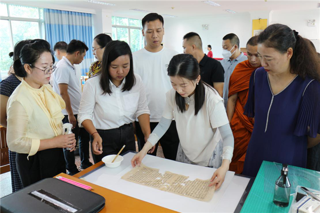 此次培训班,州图书馆邀请复旦大学图书馆古籍部古籍修复师李燕和徐强担任授课教师,学员主要学习傣文古籍修复技术,基于科学检测的古籍修复方案制定、古籍修复档案的制作、中国书画装裱修复简介与操作实践等内容。在培训期间,老师们通过理论讲解、现场演示和实际操作相结合的方式,向学员们传授古籍修复方法,工艺流程、材料选择和工具使用等方面的知识和技能。学员们不仅学习古籍的破损类型与成因分析,还实践操作参与书页修补、装订等实践操作环节,在实践中学员修复技术明显提高。(文图:西双版纳州图书馆 张春华)
