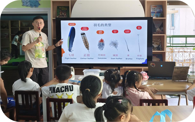 活动伊始,老师便引导孩子们聚焦于我们身边常见的鸟类,通过一系列生动有趣的互动环节,激发了他们对鸟类特征的好奇心。在老师的带领下,孩子们仔细观察了各种颜色和形状的羽毛,了解了羽毛不仅能为鸟类提供保温作用,还能帮助它们在天空中自由翱翔。随后,讨论转向了鸟类的翅膀,老师详细解释了翅膀如何帮助鸟类实现飞翔的梦想