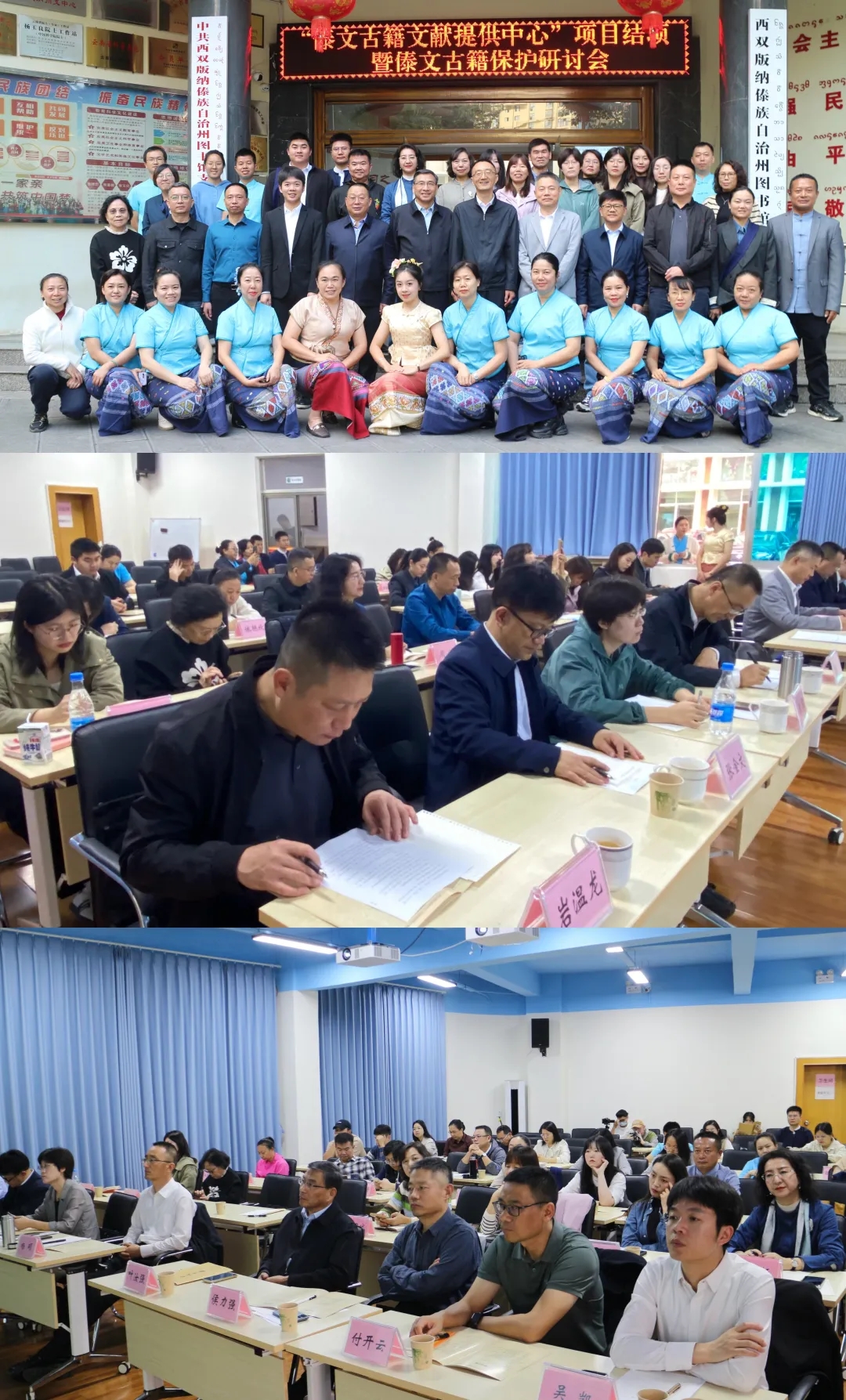 12月18日,由中国古籍保护协会、云南省图书馆(云南省古籍保护中心)、西双版纳州文化和旅游局主办,西双版纳州图书馆承办的“傣文古籍文献提供中心”项目结项暨傣文古籍保护研讨会在云南省西双版纳州举办。中国古籍保护协会副会长叶汝强,国家民委全国少数民族古籍整理研究室副主任杨硕,复旦大学图书馆党委书记、常务副馆长侯力强,云南省图书馆党委书记、馆长杨和祥,云南省少数民族古籍整理出版规划办公室主任张金文,西双版纳州文化和旅游局副局长岩温龙,以及来自武汉大学、云南大学、西藏布达拉宫管理处、西双版纳州档案局、西双版纳州民族团结进步促进中心等单位的领导嘉宾和傣文古籍保护研究的专家学者,共计40余人参会。
