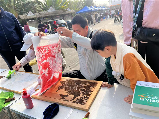 二是传拓体验活动:拓印是一项历史悠久的古老技艺,是国家级非物质文化遗产,为落实习近平总书记弘扬中华优秀传统文化的指示精神,开展“非遗文化·传拓”体验活动,州图书馆特别准备了刻有大象与孔雀的两块模版,由老师指导进行拓印。