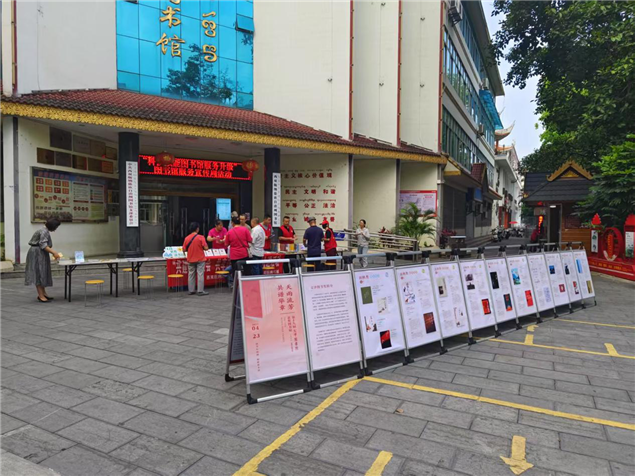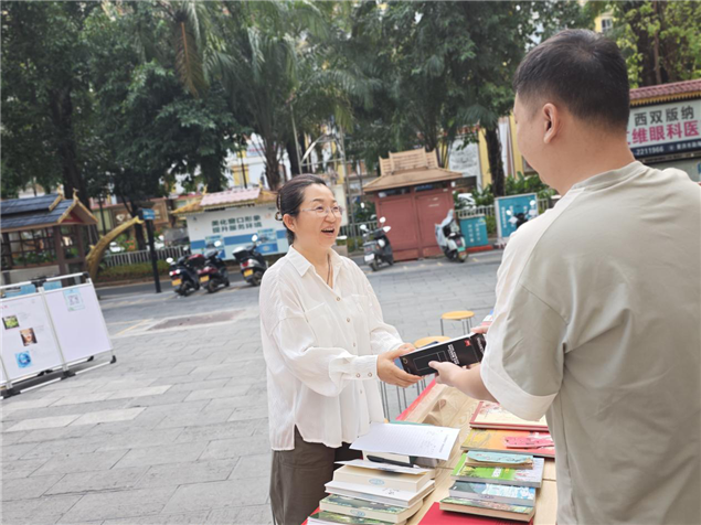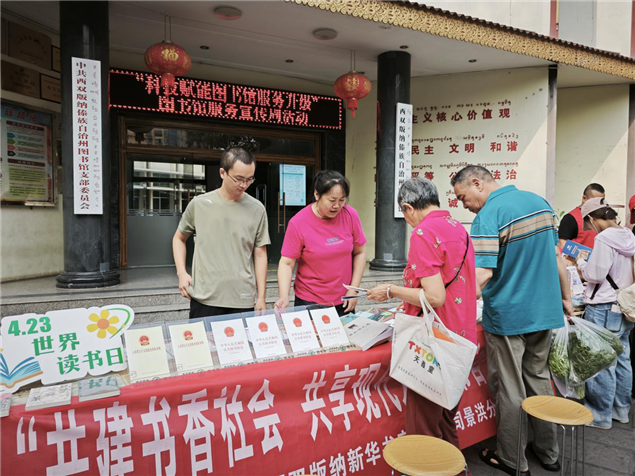 4 月 23 日当天,州图书馆联合景洪市图书馆、西双版纳新华书店,在勐泐文化广场州图书馆大门前,积极向群众宣传《中华人民共和国公共图书馆法》和《云南公共文化服务保障条例》,增强公众对公共文化服务法规的了解。同时,开展 “您阅读我买单” 服务,让读者拥有更多的图书选择权。此外,活动现场还向读者推广普及促进全民阅读的新技术、新载体、新服务,让大家感受到科技为阅读带来的便捷与创新。