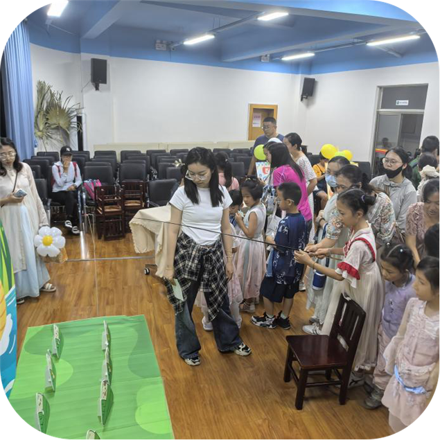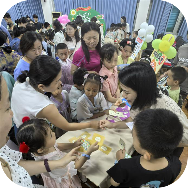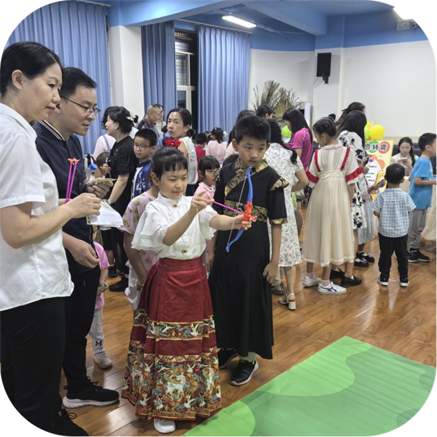 阅读分享结束后,全体小朋友和家长共同起立,齐声高唱红歌《歌唱祖国》。“五星红旗迎风飘扬,胜利歌声多么响亮……”激昂的旋律中,孩子们清脆的童声与家长铿锵的歌声交织在一起,点燃爱国热情。 接下来的游园集章体验环节以 “传统民俗 + 趣味知识” 设计的四大游园项目,吸引了众多家庭组队参与集章挑战。在“射五毒” 投壶体验中,孩子们化身古代小英雄,感受端午驱邪纳吉传统;“钓粽子” 游戏考验手眼协调,钓起 “粽子模型” 的欢呼此起彼伏;脑筋急转弯与百科答题区,孩子们踊跃思考,现场充满欢声笑语。