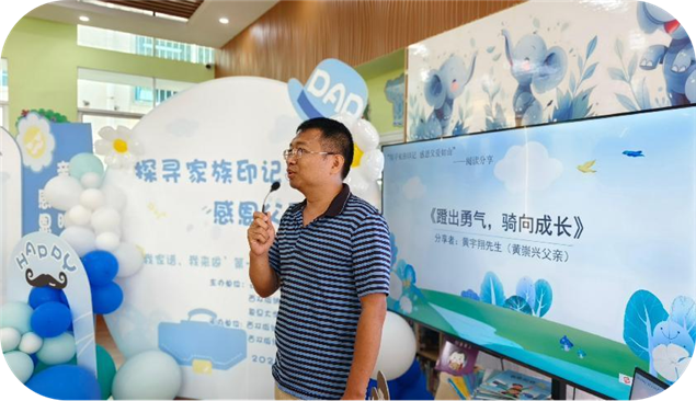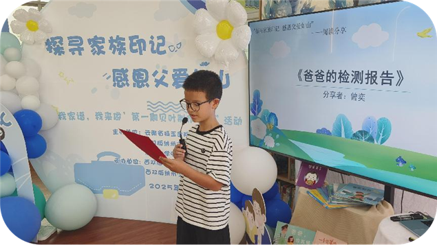 阅读分享环节暖意融融。曾奕小朋友以《爸爸的检测报告》,描绘父亲在实验室保障民生安全的严谨与居家时的温柔守护;李笑笑小朋友在《西游声韵里的父爱印记》中,追忆父亲绘声绘色讲述经典、将阅读热爱与深沉父爱深植心间的夜晚;父亲代表黄宇翔分享《蹬出勇气,骑向成长》,讲述见证孩子克服学车恐惧的喜悦,说出亲子时光的珍贵意义。