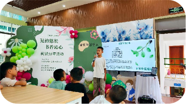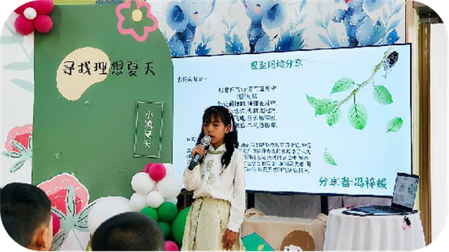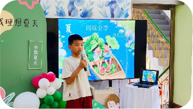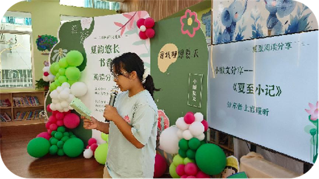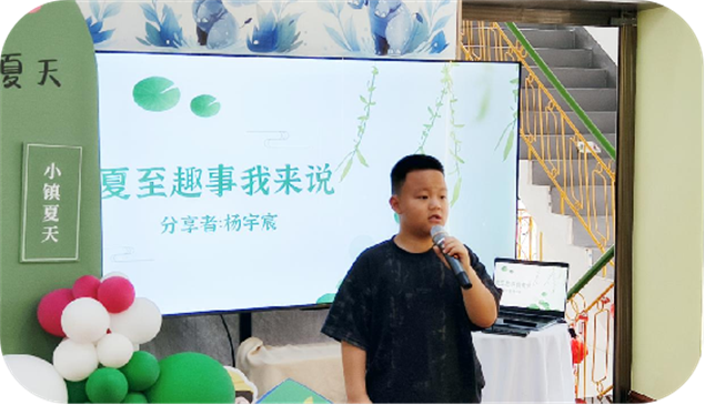 阅读分享环节将活动推向高潮。张程萱用生动语言解读《什么是夏至》,把复杂天文知识讲得明明白白;徐若尘朗读《森林报》夏日篇章,仿佛让大家置身绿意盎然的森林;上官瑾昕带来优美散文,匡胤铭和冯梓媛朗诵夏至古诗,各展风采。杨宇宸讲述的“西瓜怪兽”故事,更是逗得全场捧腹大笑。分享后,大家一起学习夏至谚语,感叹古人智慧的奇妙。