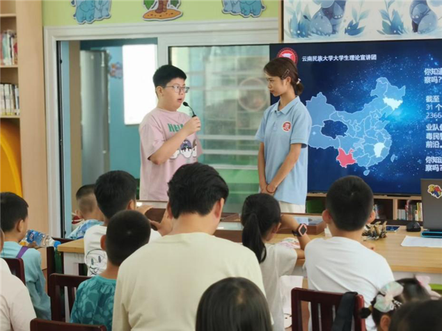 课程最后,云南民族大学理论宣讲团为孩子们带来了榜样力量的宣传。分享人王茜婕绘声绘色地讲述了缉毒警察柯占军的故事,孩子们深受触动。令人惊喜的是,许多小朋友表示自己听说过柯占军叔叔,还主动上台分享他们心中的英雄故事。