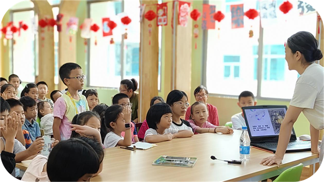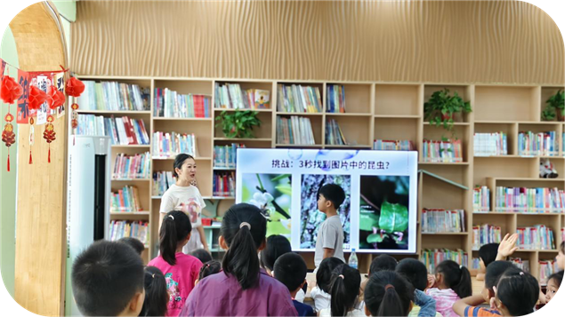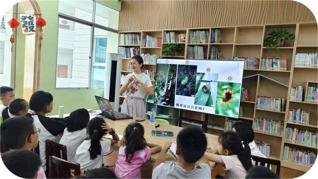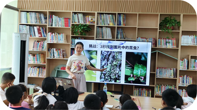 活动中,罗老师带孩子们“认识”了黑暗里的“小歌手”——纺织娘的“滋滋”声、竹蛉的“清脆小调”、巨拟叶螽的“低沉鸣叫”,还分享了实用观察技巧:“看月亮位相变化能帮咱们找昆虫呢!不同月相下,昆虫的活跃时间不一样。”孩子们听得格外认真,昆虫的独特鸣叫都让他们兴奋地睁大眼睛。