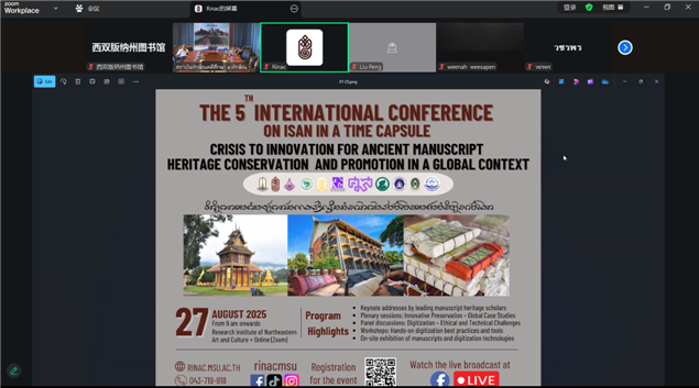 2025年8月27日,由泰国马哈沙拉堪大学东北艺术文化研究所主办的“第五届国际会议:全球背景下古代手稿遗产保护与推广的危机与创新”在泰国隆重召开。本次会议采用线上与线下相结合的方式举行,吸引了来自中国、缅甸、老挝、柬埔寨、法国、德国、美国等多个国家的专家学者参与。