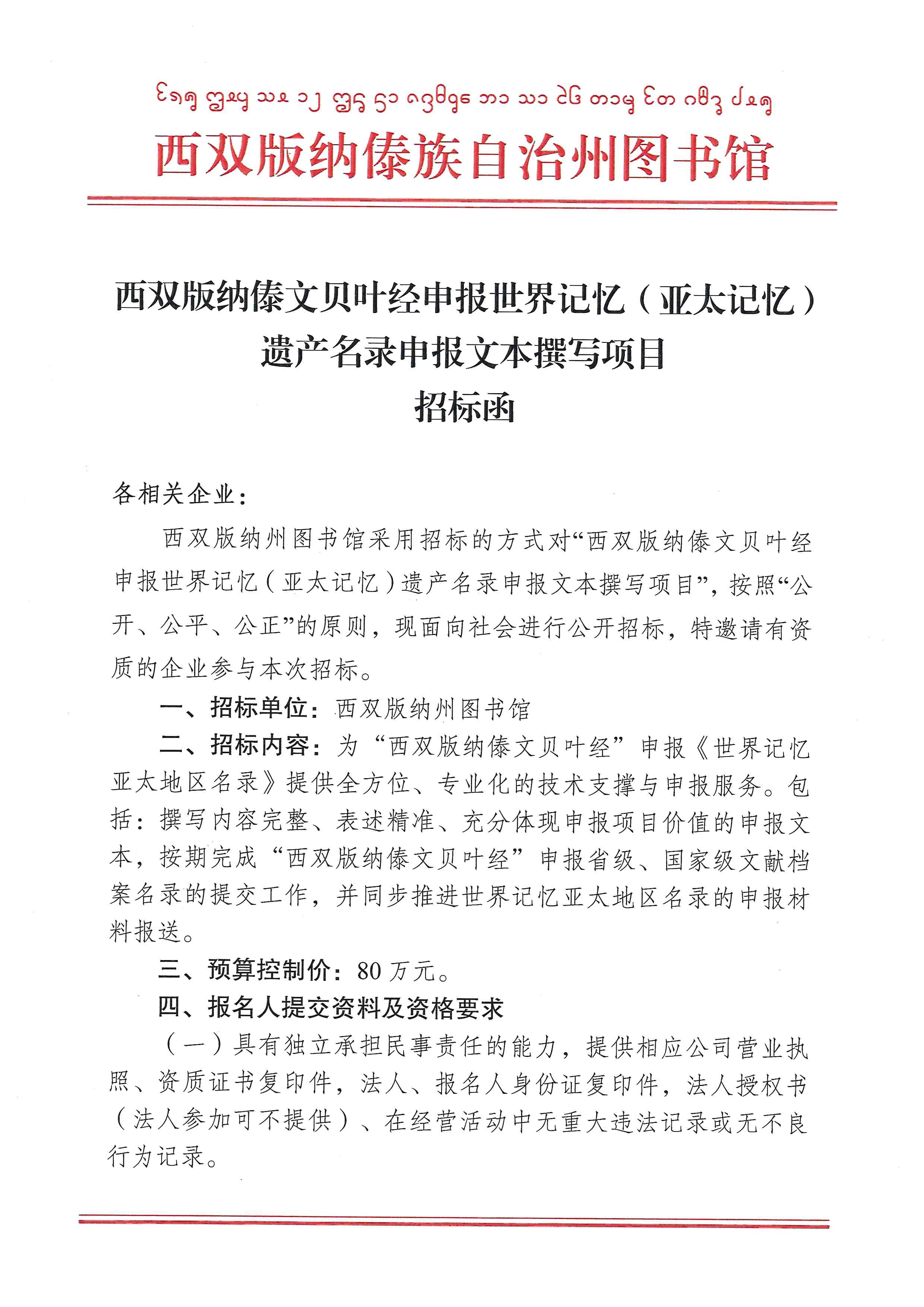 西双版纳傣文贝叶经申报世界记忆(亚太记忆)遗产名录申报文本撰写项目招标函