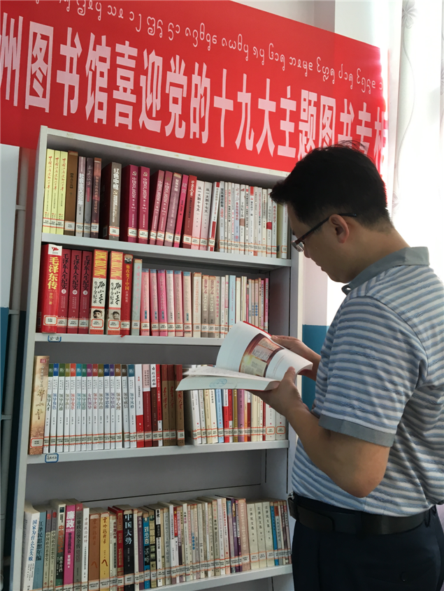 为了迎接党的十九大胜利召开,州图书馆从2017年9月1日开始在电子移动图书馆、图书自助借阅室、电子阅览室开设“喜迎党的十九大优秀图书”专柜推荐活动,吸引市民前来阅读。